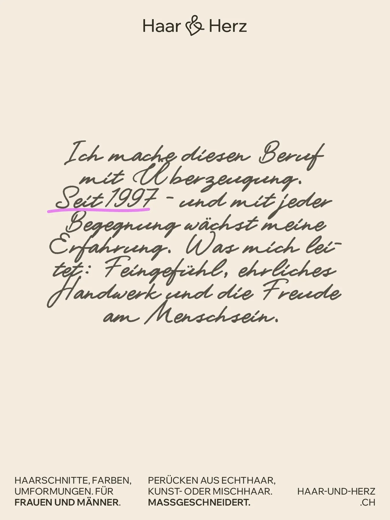 Ich arbeite mit Menschen und mit Haaren. Mit Sorgfalt, Erfahrung und einem Blick fürs Wesentliche. Jeder Termin ist anders, jede Begegnung zählt.